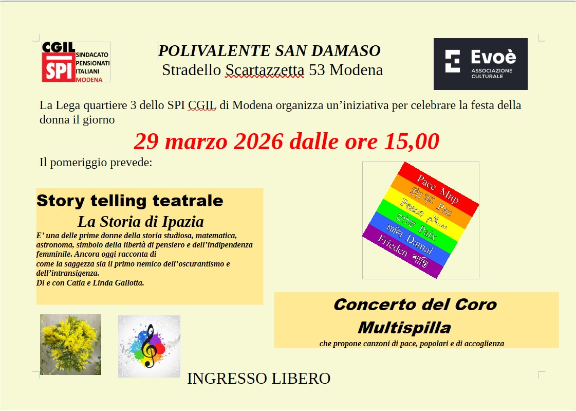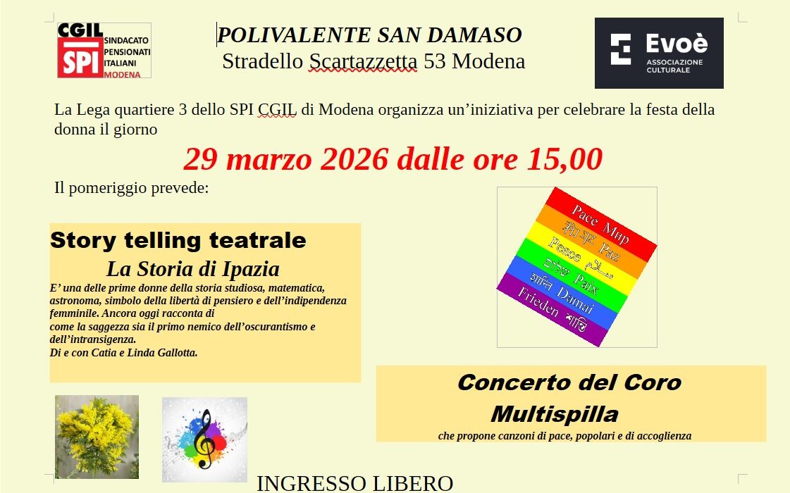 Spimo’: 8 MARZO 2026 AUGURI A TUTTE LE DONNE CON L’INIZIATIVA DONNE IN MUSICA ORGANIZZATA IL 6 MARZO 2026 DAL COORDINAMENTO DONNE SPI CGIL MODENA | FUORI LA GUERRA DALLA STORIA 7 MARZO 2026 MANIFESTAZIONE PER FERMARE LA GUERRA | SYSTEM CERAMICS DI FIORANO MODENSE ASSEMBLEA SULLA PARITA’ DI GENERE