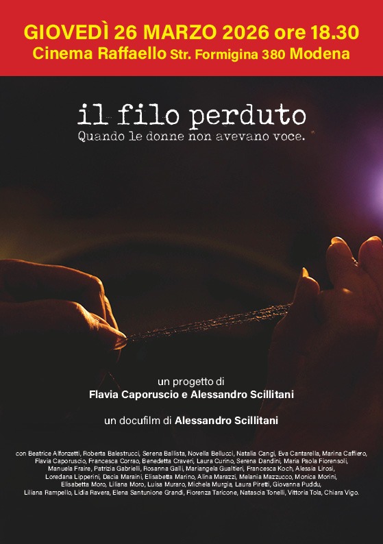 MODENA, 26 MARZO 2026 ORE 18:30 PRESSO IL CINEMA RAFFAELLO PROIEZIONE DEL DOCUFILM “IL FILO PERDUTO – QUANDO LE DONNE NON AVEVANO VOCE” PROMOSSO DA ARTEMIDE FILM, CGIL MODENA, UDI MODENA, COORDINAMENTO DONNE SPI MODENA