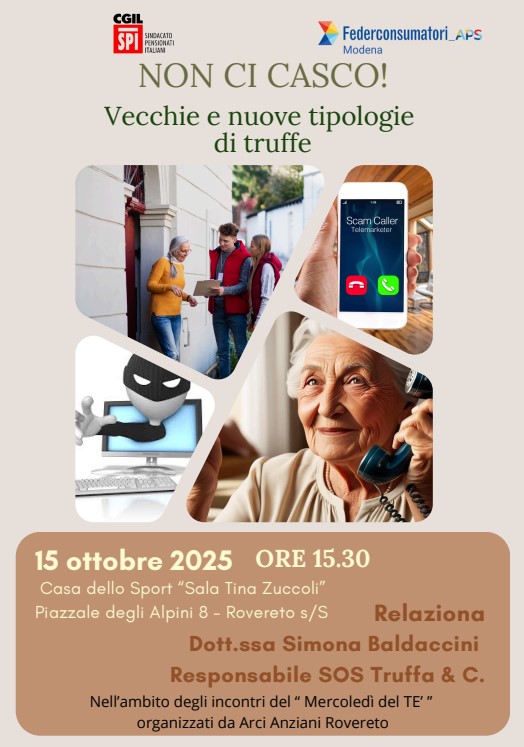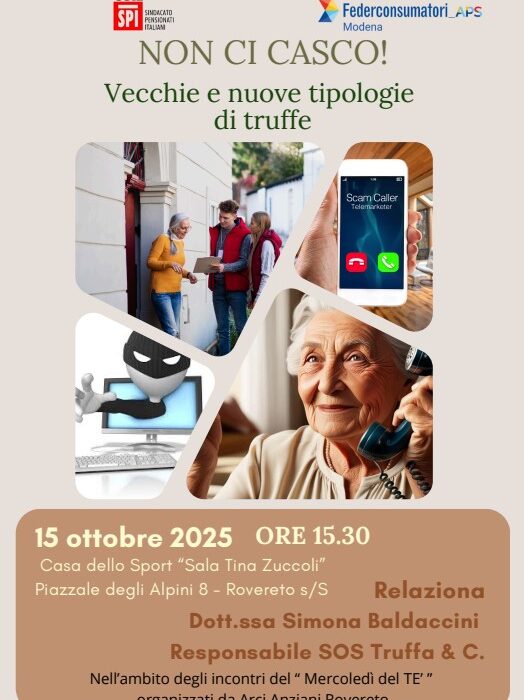 Rovereto sulla Secchia (Mo), 15 ottobre 2025 ore 15:30 iniziativa “Non ci casco! Vecchie e nuove tipologie di truffe”. Promotori Spi CGIL distretto di Carpi e Federconsumatori Modena