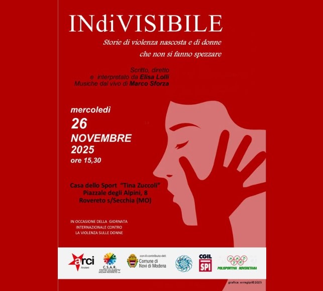 Rovereto sulla Secchia (MO), in occasione della giornata internazionale contro la violenza sulle donne, 26 novembre 2025 ore 15,30 l’iniziativa “INdiVISIBILE”, storie di violenza nascosta e di donne che non si fanno spezzare